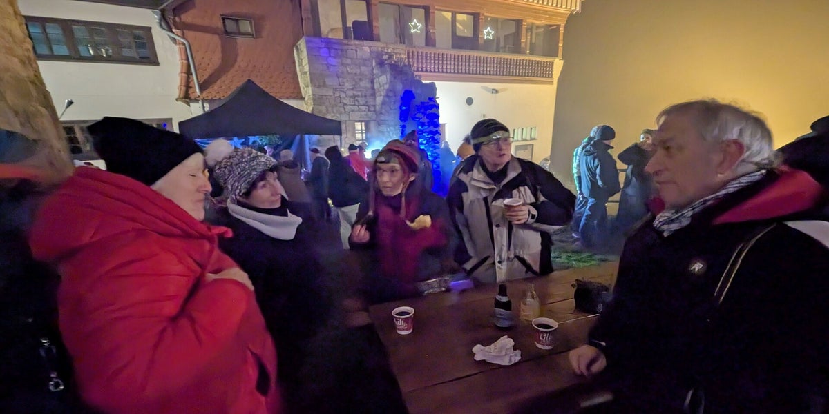 Heute, 27.12.2024, waren wir auf der Glühweinwanderung zur Burg Normannstein in Treffurt. Es war kalt, es war neblig, aber es war eine tolle Veranstaltung. Die etwa 2,5 km lange Rundwanderung begann mit der ersten Glühweinhütte am Fuß der Burg, wo wir auch einen ersten Glühwein probierten. Danach liefen wir hinauf auf der Straße, vorbei an einigen Foto-Hotspots, bis zur zweiten Hütte am "Steinbruch" und gönnten uns wieder einen Glühwein.