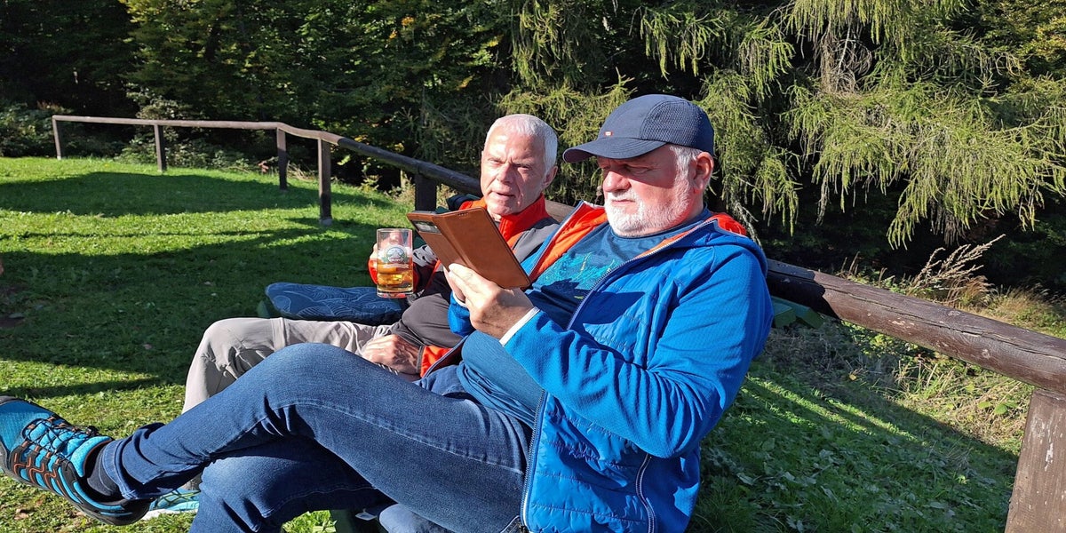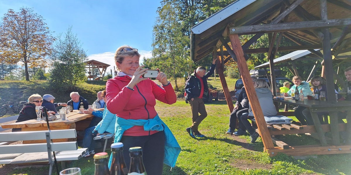 Wir fanden eine Bank in der Sonne und gönnten uns Bier, Bratwurst, später Kaffee und selbstgebackenen Kuchen. Mit Barbara und Uthart kamen noch weitere Freunde dazu und gemeinsam genossen wir das schöne herbstliche Wetter im Sonnenschein. Später kam Uwe mit Gitarre heraus und wir als Mitglieder des Skiclubs Eisenach brachten den Ruhlaer Sportfreunden und ihren Gästen ein paar Ständchen. Nach 15:00 Uhr stiegen wir wieder ab ins Bermbachtal und fuhren nach Hause. Ein sehr schöner Feiertag, geruhsam, frei von Hektik und unter Freunden.