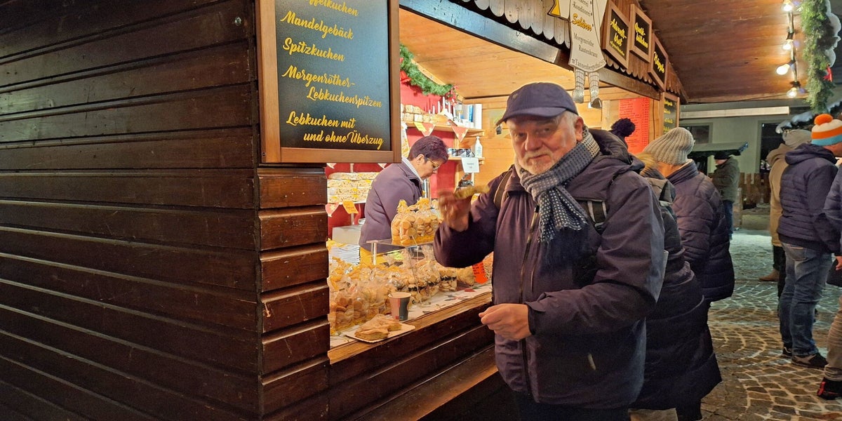Der Weihnachtsmarkt in Auerbach, den wir in den letzten Jahren schon öfter besucht haben, ist großzügig im Zentrum des Orten angelegt, bietet eine gute Mischung von Buden mit Speisen und Getränken sowie mit handwerklichen und lokalen Erzeugnissen. Natürlich gönnten wir uns Glühwein und stärkten uns mit Gebratenem und Gesottenem.