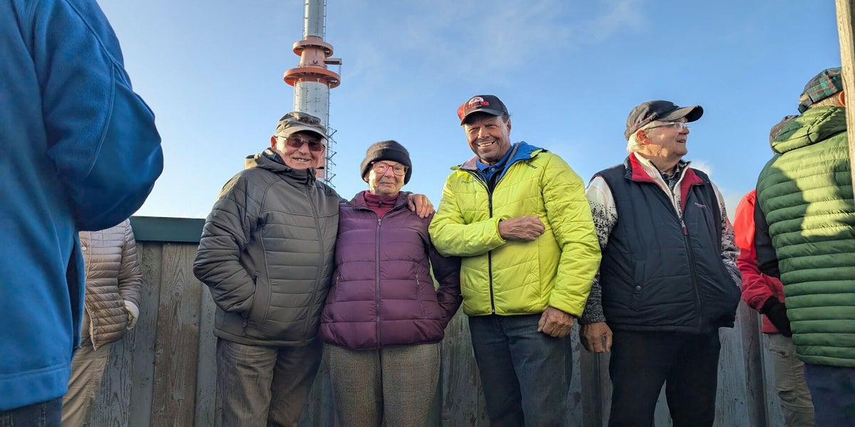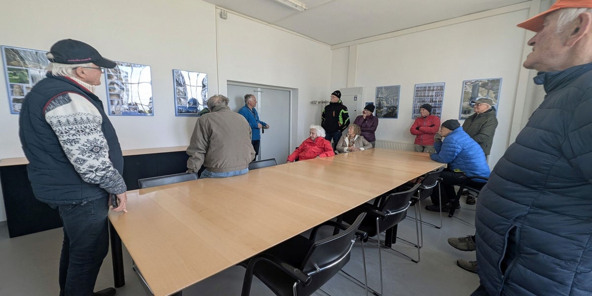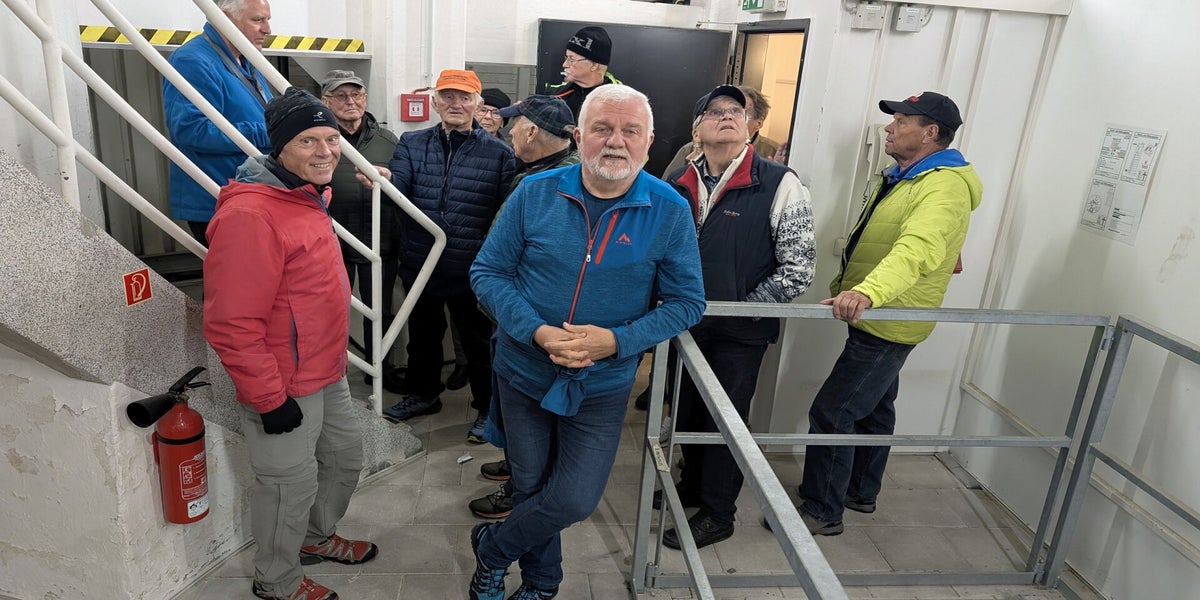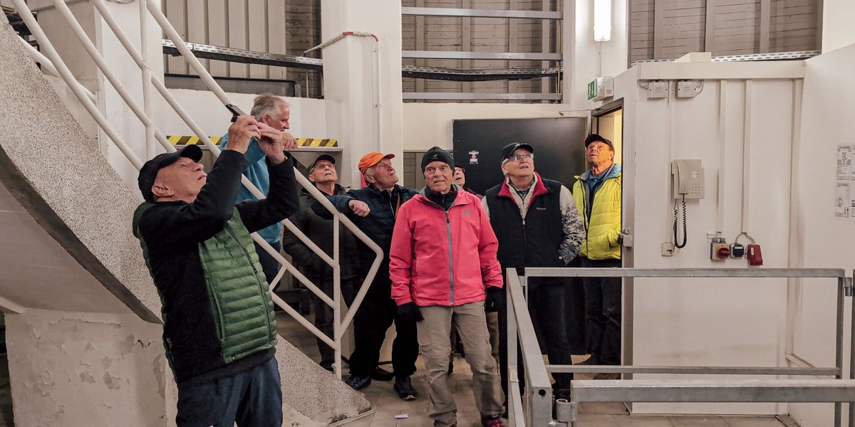 Inge hatte zu Hause zwei Kuchen gebacken und mit auf den Berg gebracht. So gab es nach dem Singen Kaffee und Kuchen und angeregte Gespräche. Für 15:00 Uhr war eine Führung auf dem Gelände am Funkturm geplant. Also gingen wir rechtzeitig gemeinsam auf den Gipfel des Berges zum Haupttor des Telekom-Geländes. Hier nahm uns ein Mitarbeiter in Empfang und führte uns als erstes ins ehemalige Maschinenhaus.