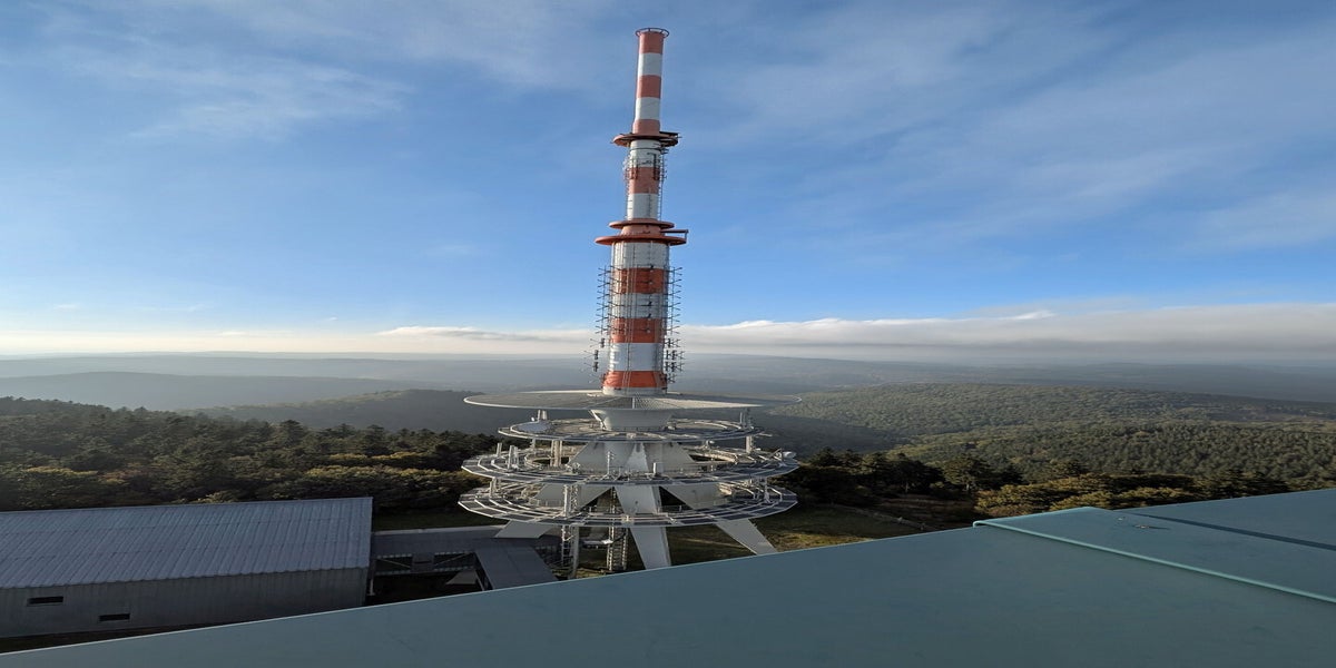 Beim Klick auf das Foto vom Funkturm gibt´s ein Video von der Aussichtsplattform am Rundturm auf dem Inselsberg.