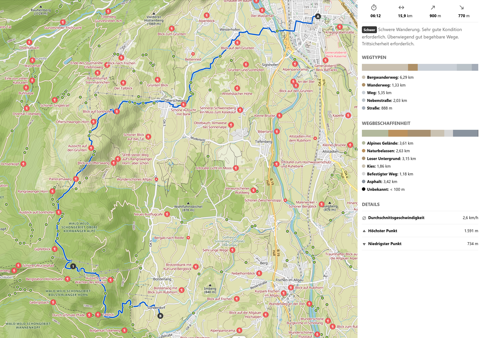 Auf der Strecke von Sonthofen nach Bolsterlang/Sonderdorf habe ich in 4,25 Stunden 15 km zu Fuß zurückgelegt, trotz Sessellift 1.150 Höhenmeter im Anstieg und 569 Höhenmeter im Abstieg bewältigt. Ohne die Benutzung von Sessellift und Hörnerbahn wäre ich wahrscheinlich in das Gewitter hineingeraten.