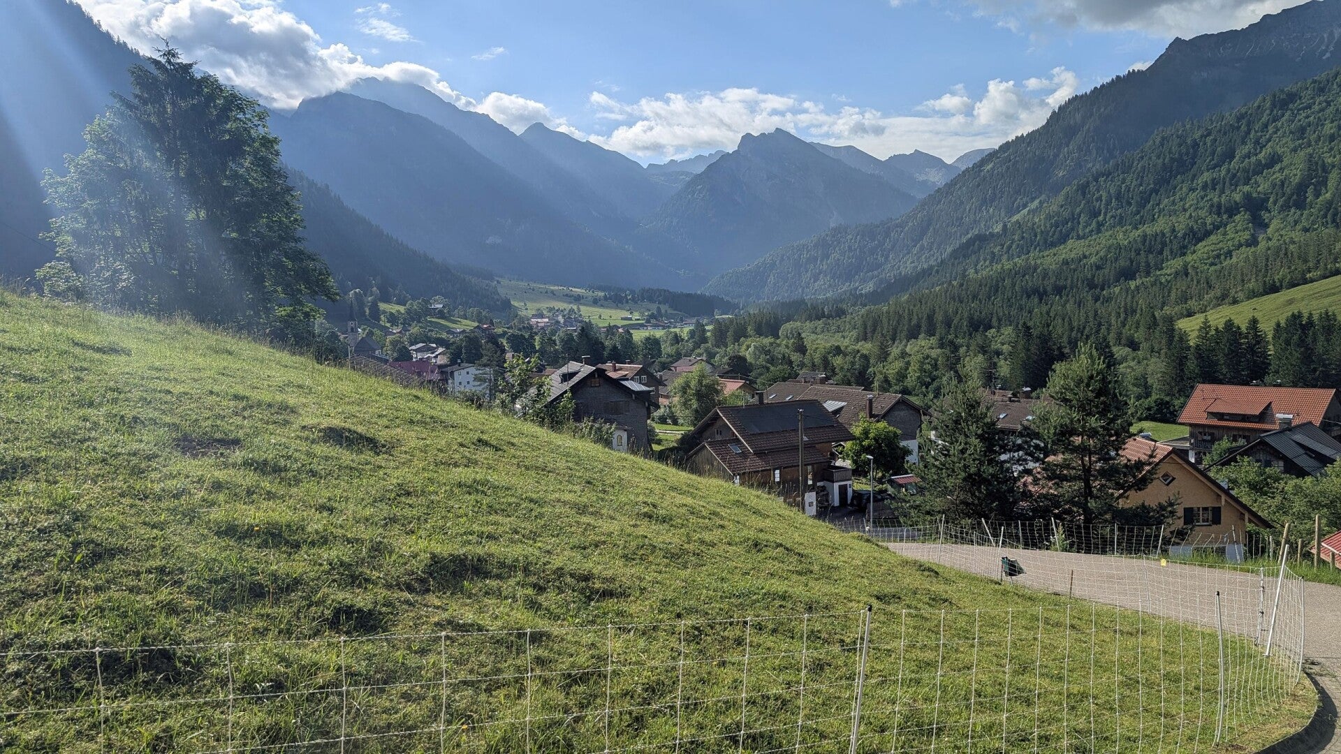 Nach dem Frühstück im Waidmannsheil in Hinterstein musste ich noch ca. 200 m entlang der Dorfstraße laufen, dann bog der Wanderweg rechts ab hinauf zum Bärenweg in Richtung Bad Oberdorf. Nach einem kurzen, steinigen Abstieg verlief der Weg weiter auf dem Vaterlandsweg bis zum Hotel Prinz-Luitpold-Bad. Ein sehr schöner Panoramaweg, der viele schöne Ausblicke bot.