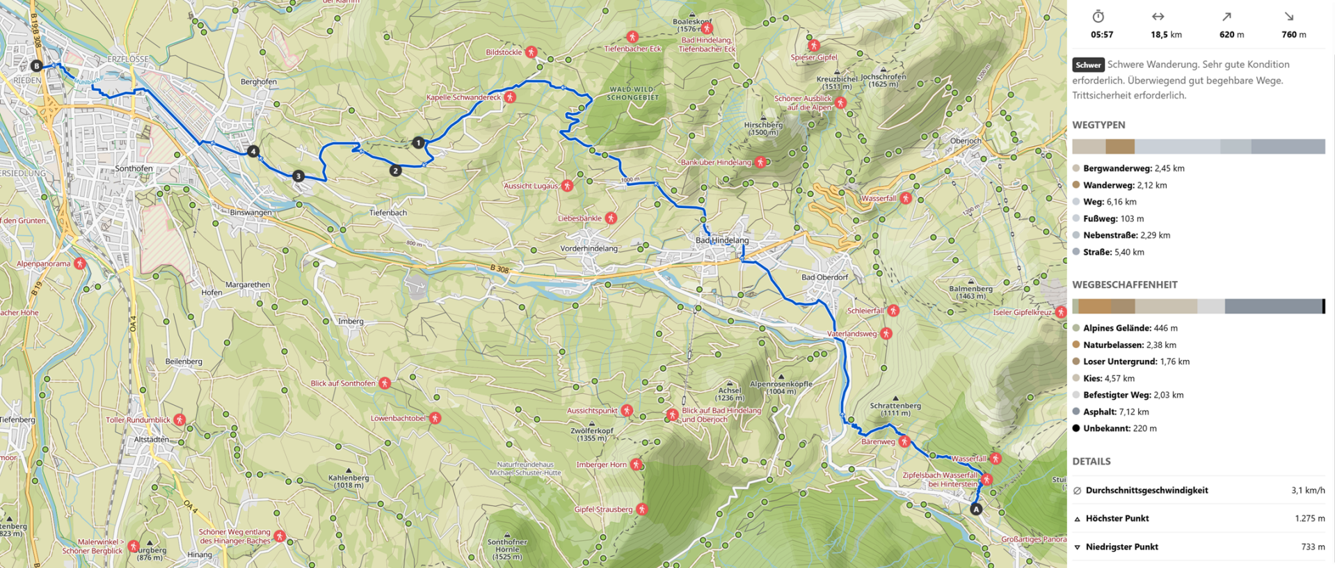Insgesamt war ich an diesem Tag ca. 15 km gewandert (12,3 km von Hinterstein bis zur Bushaltestelle und 2,8 km von der Innenstadt bis zum Hotel), war ca. 265 Höhenmeter aufgestiegen und 435 abgestiegen. Unterwegs war ich an diesem Tag nur 3 Stunden und 50 Minuten.